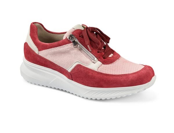 Komfortabel röd damkänga i mocka med snörning och dragkedja.