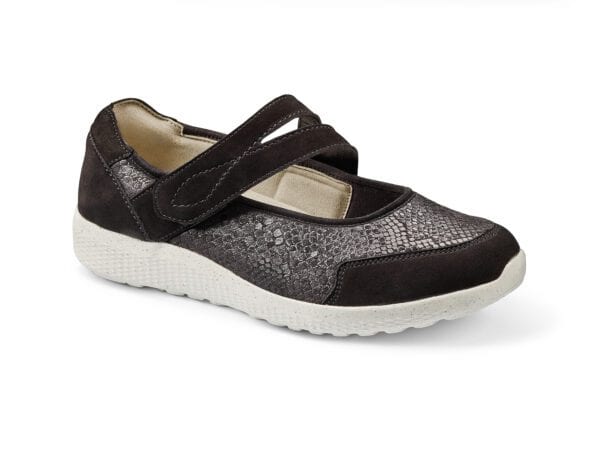 Vardagssko i svart och metallic, bekväma och stilrena för dam.