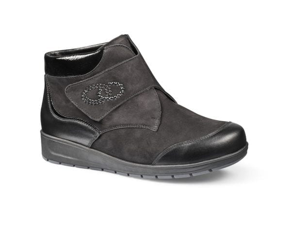 Textilfodrad känga i mocka med mycket rymd. Kardborreknäppning och uttagbar innersula för dig med egna fotbäddar.