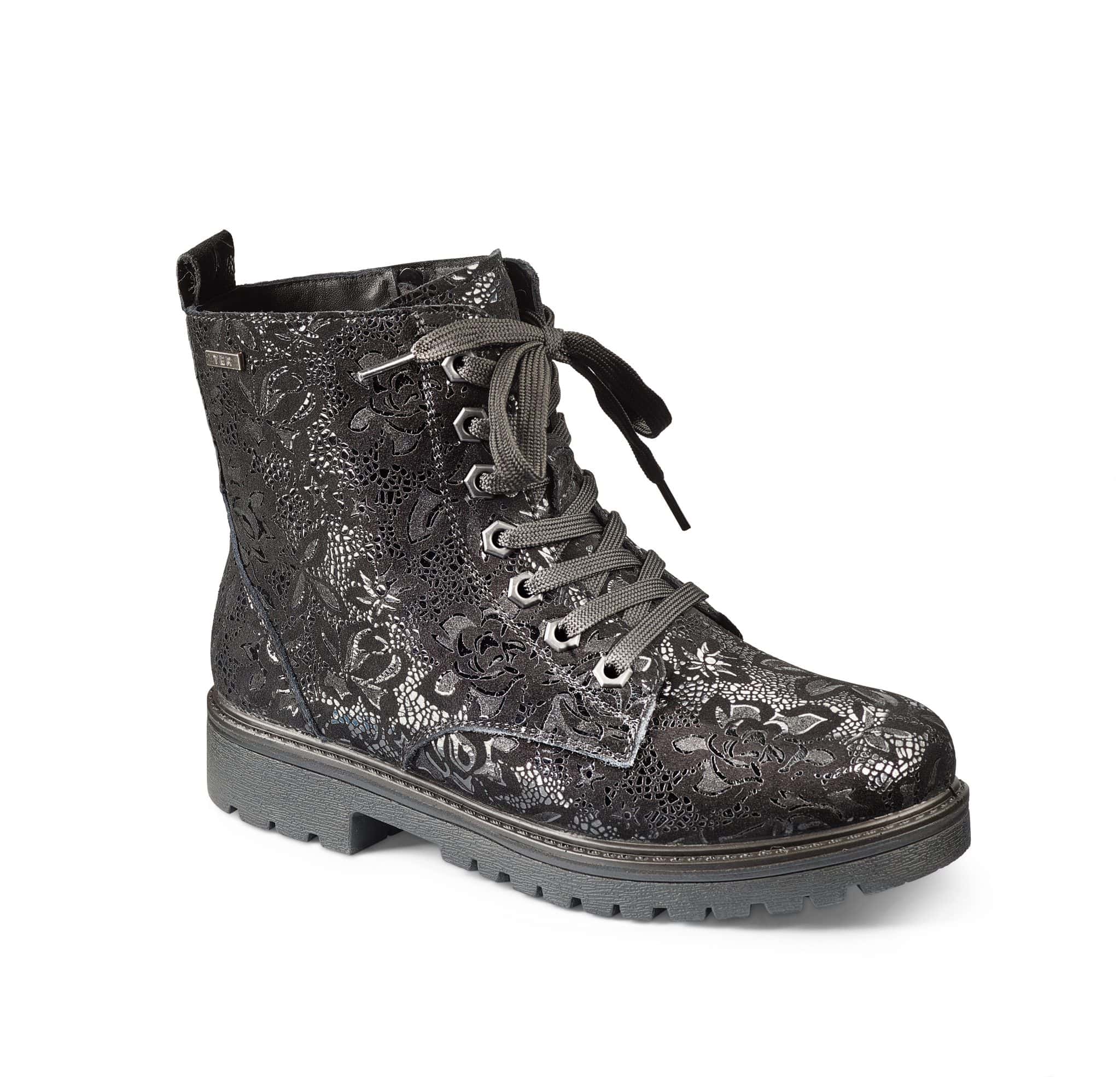 Varmfodrad vinterkänga i vackert mönstrad mocka. Blixtlås och snörning underlättar påtag. Gummisula för bästa grepp.