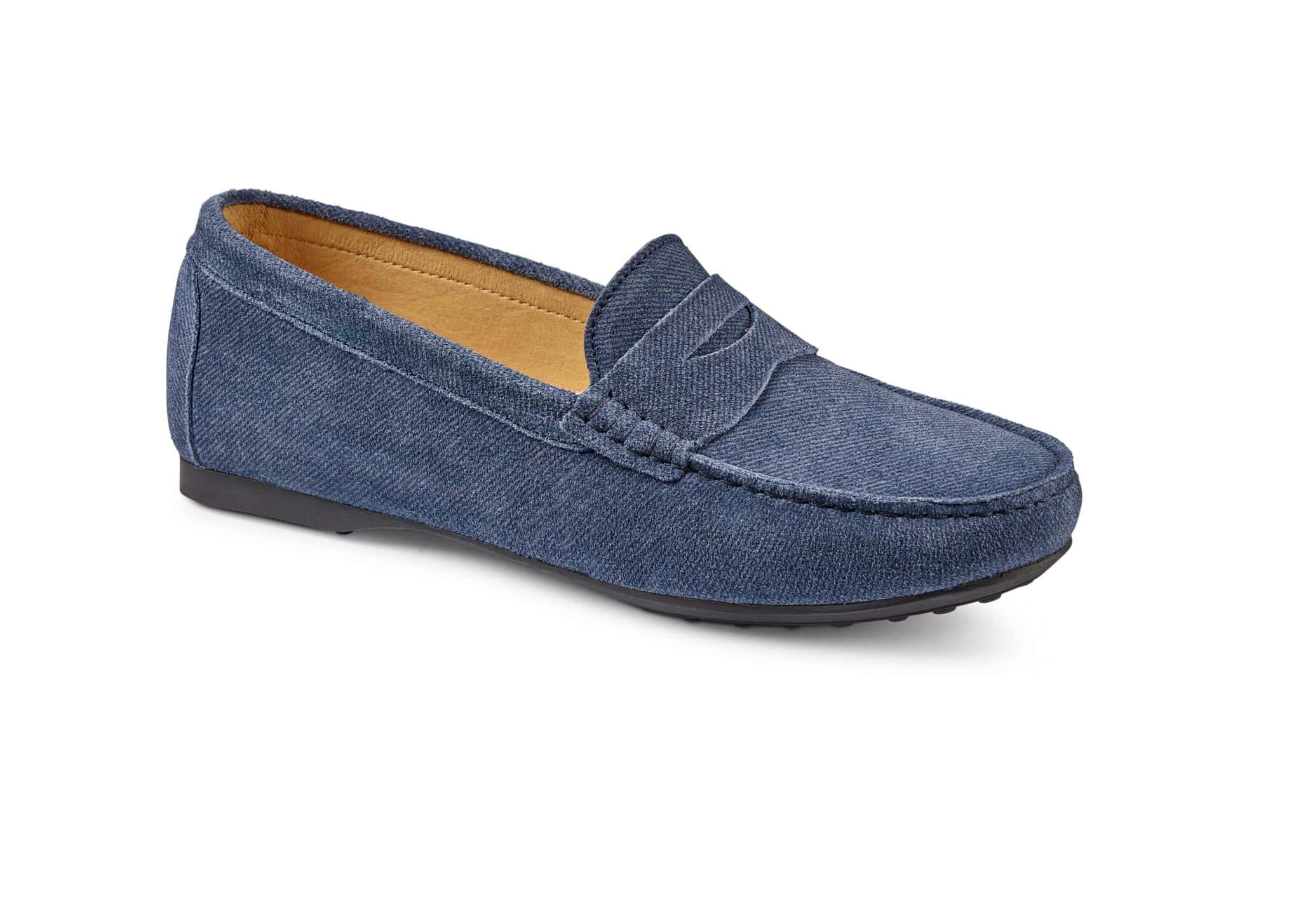 Mörkblå mockaskor för kvinnor, bekväma och stilrena.