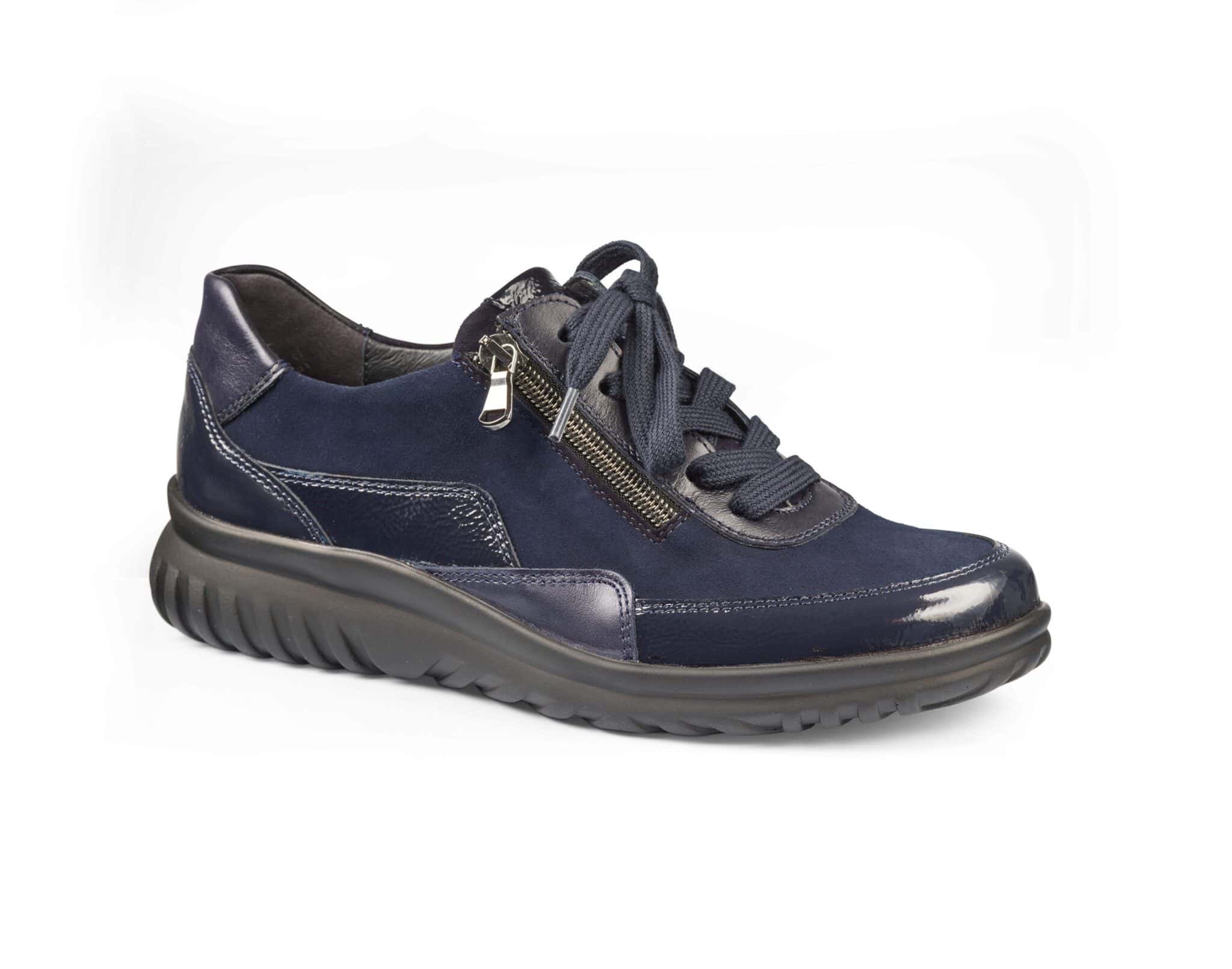 Marinblå promenadsko i mocka med snörning och dragkedja som underlättar påtag. Uttagbar innersula för dig med egna inlägg.