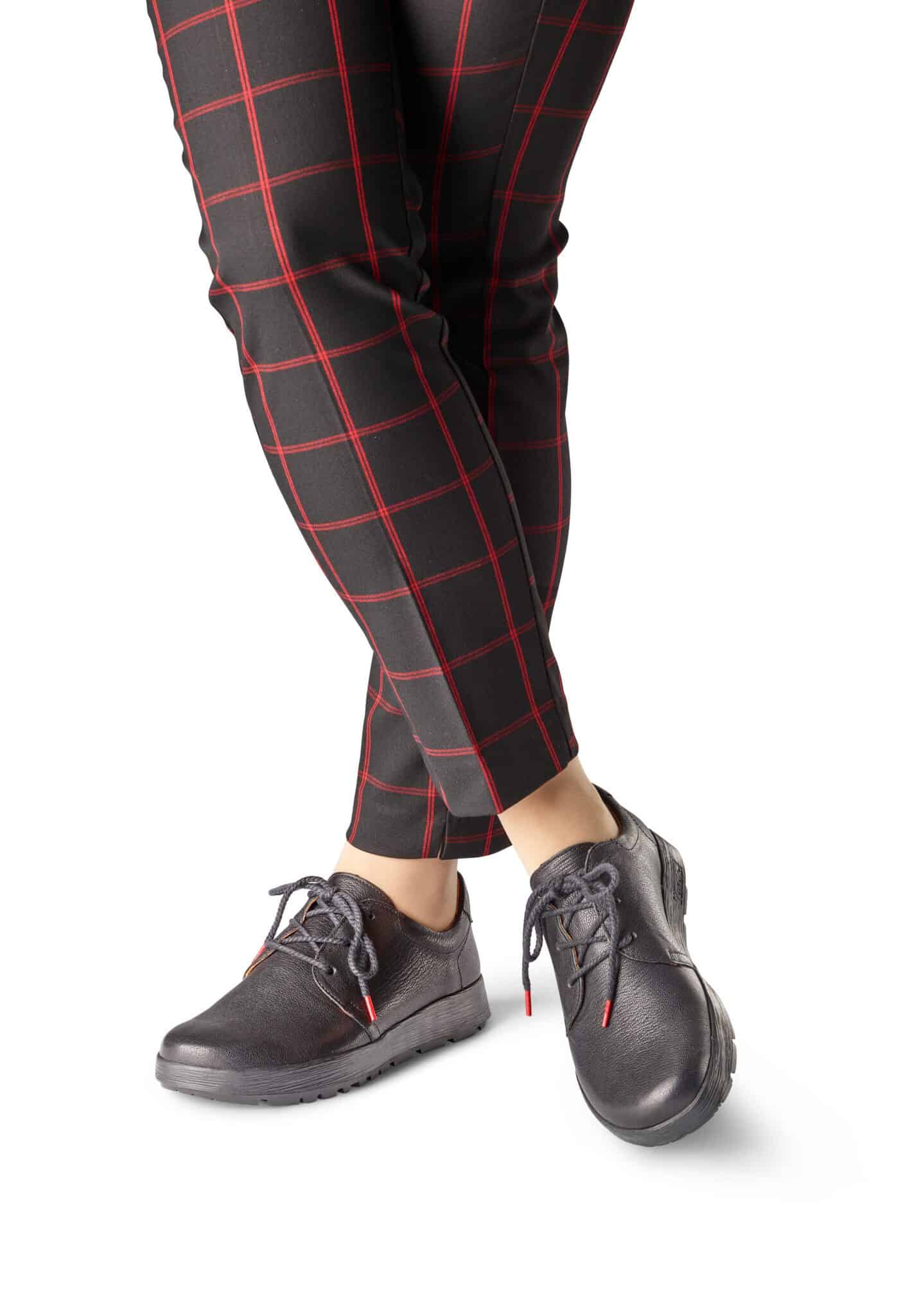 Svart skinnskor för kvinnor med snörning och sidoförvaring.