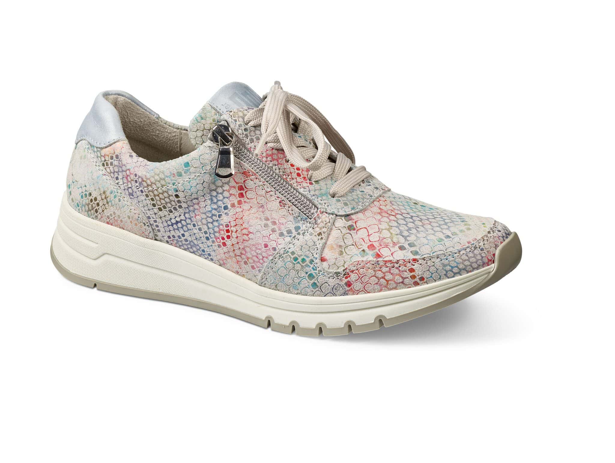 Lågskor för kvinnor i beige och vitt med snörning och dragkedja.