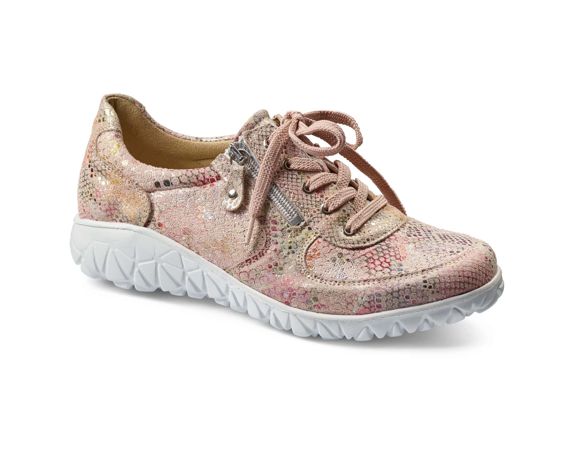En promenadsko med lätt sula, snörning och dragkedja för att underlätta på- och avtagning. Skon har uttagbar innersula för dig med egna fotbäddar.
