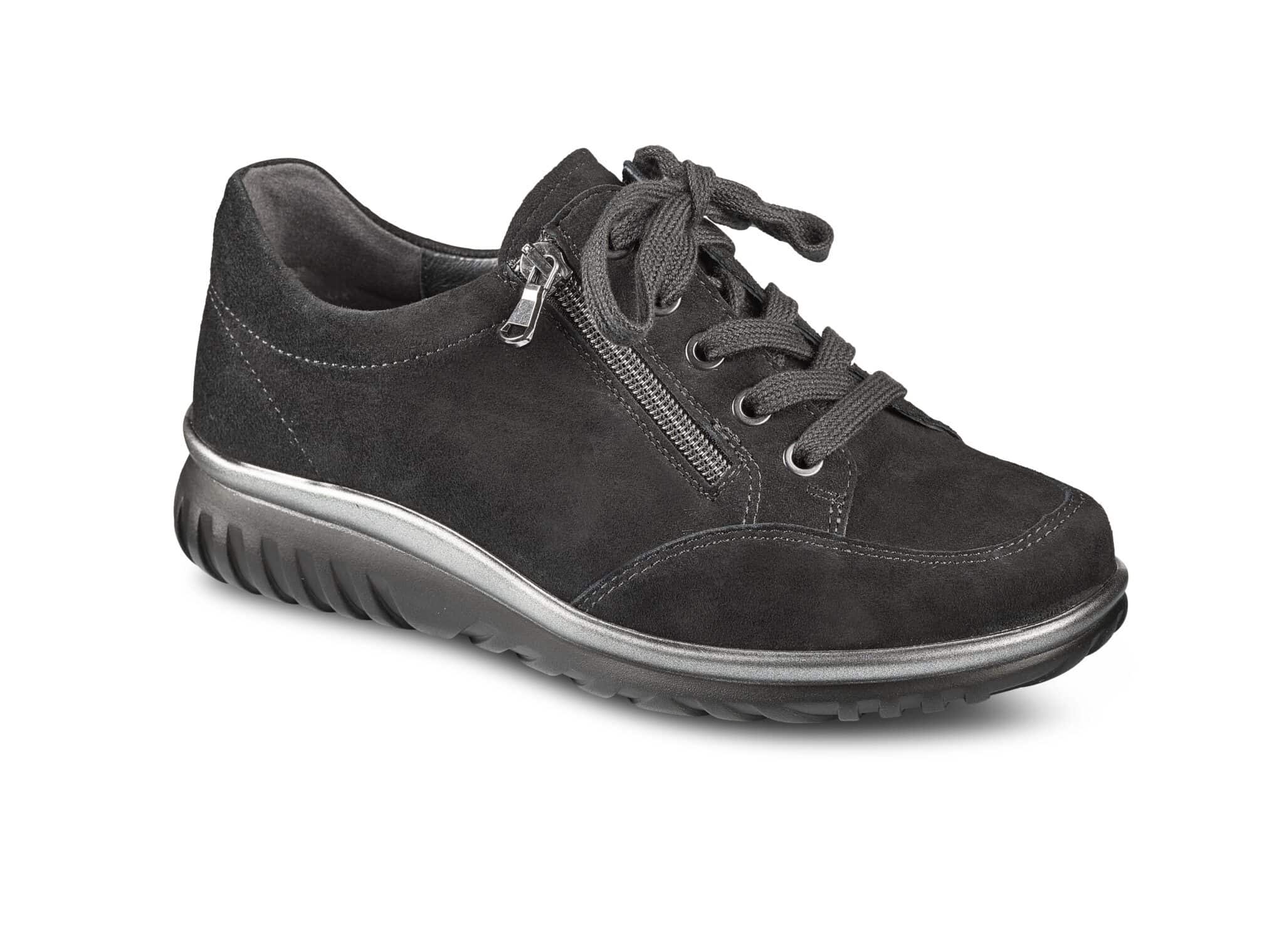 Extra rymlig promenadsko i mocka med snörning och dragkedja som underlättar vid på- och avtag av skon. Innersulan är löstagbar för dig med egna inlägg.