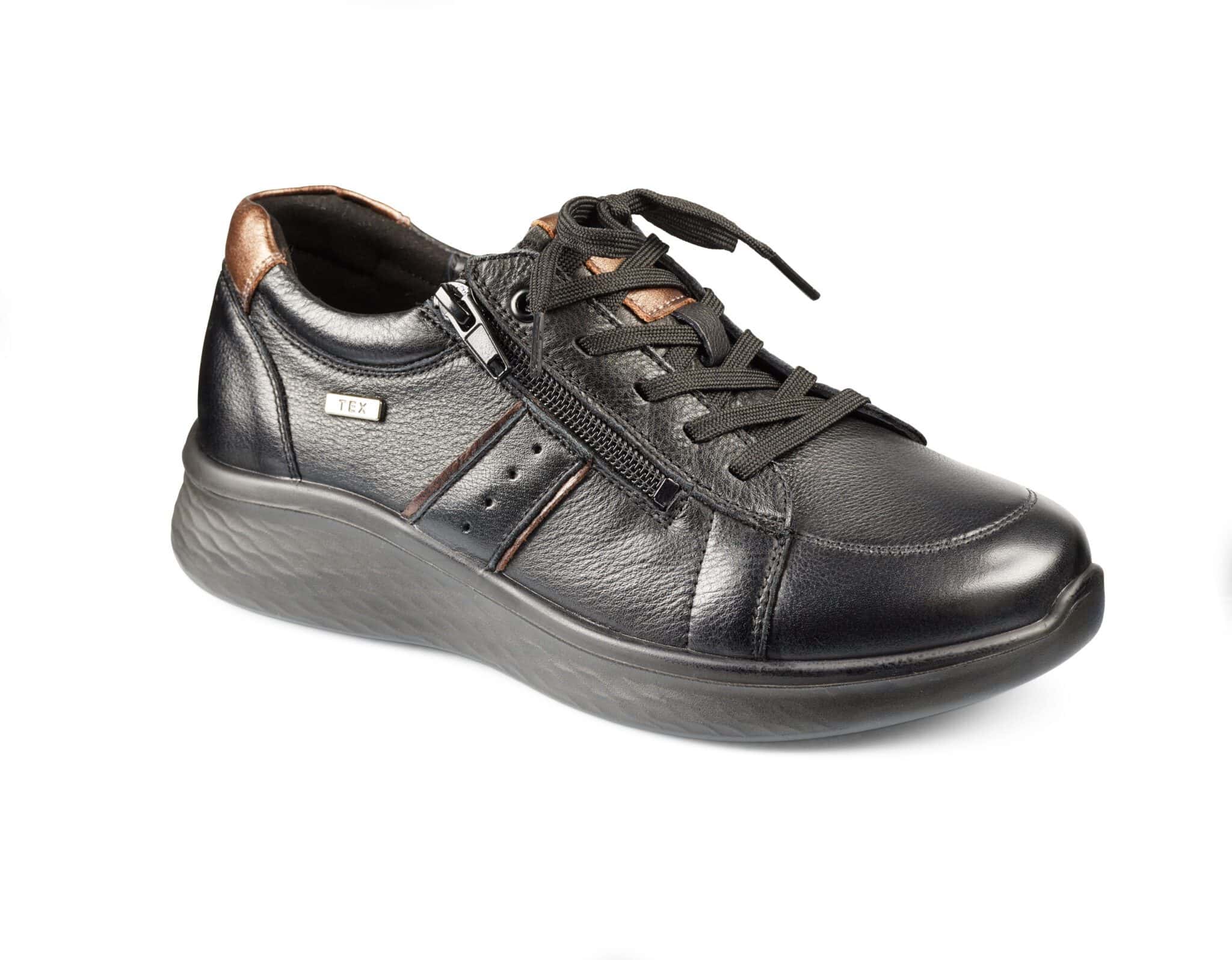 Promenadsko i skinn med snörning och dragkedja som underlättar på- och avtag. Innersulan är löstagbar för dig med egna inlägg.