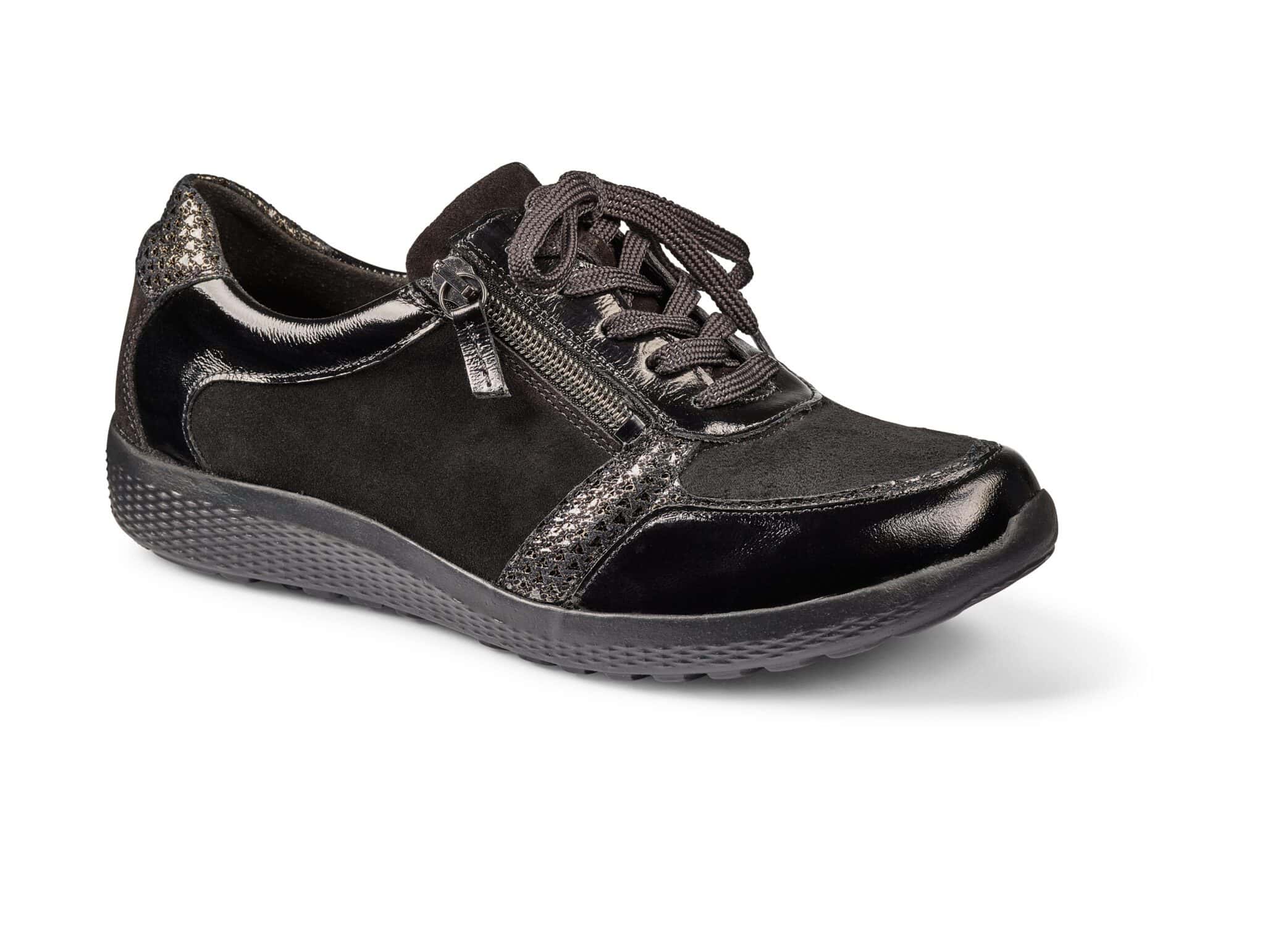 En bred promenadsko i skinn, mocka och stretchmaterial för den som behöver en extra rymlig sko. Uttagbar innersula för dig med egna fotbäddar.